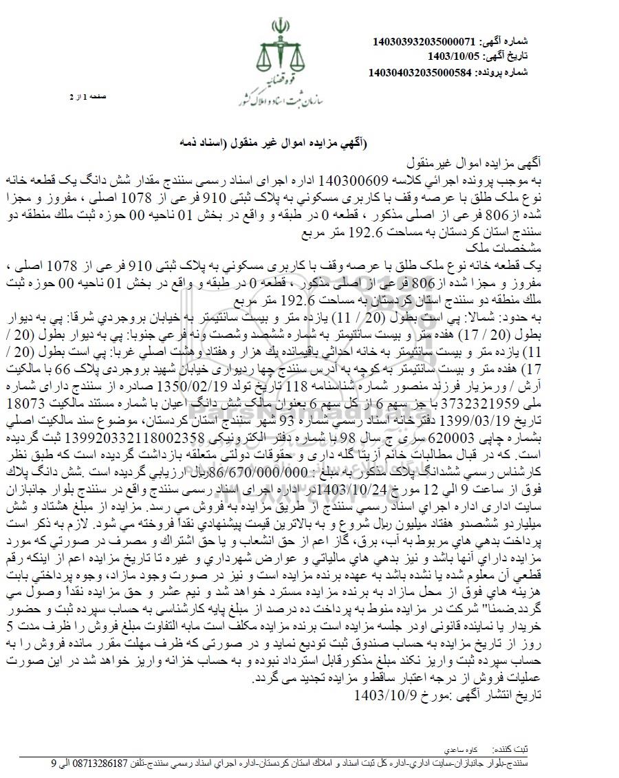 مزایده ششدانگ یک قطعه خانه با کاربری مسکونی به پلاک ثبتی 910 فرعی از 1078 اصلی به مساحت 192.6 مترمربع