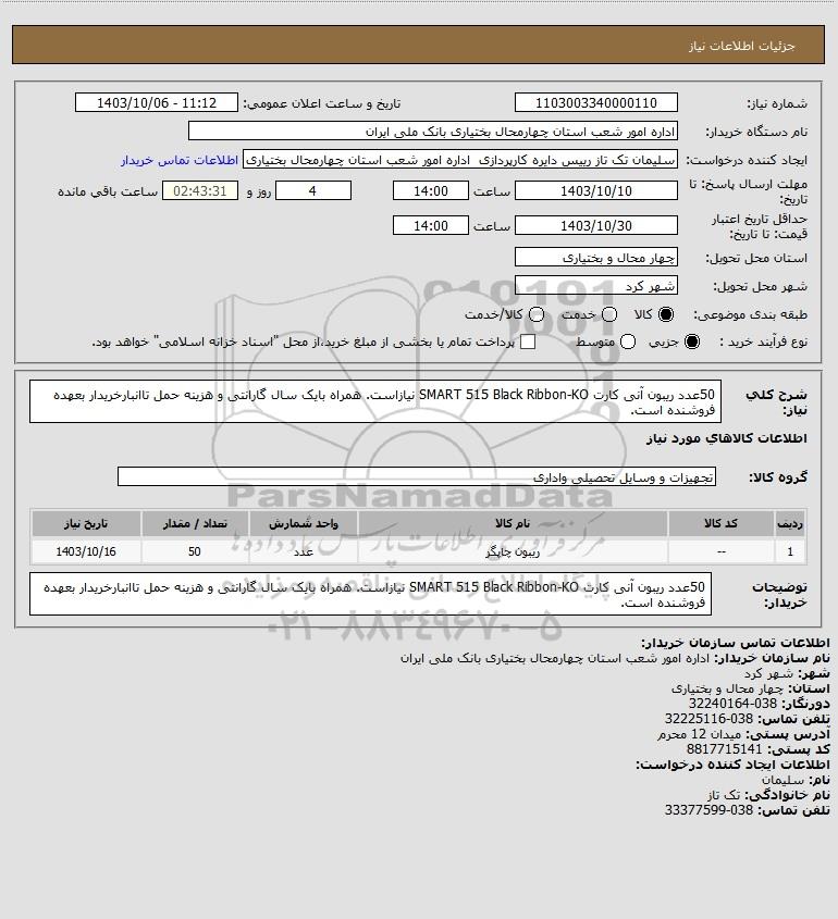 استعلام 50عدد ریبون آنی کارت SMART 515 Black Ribbon-KO نیازاست. همراه بایک سال گارانتی و هزینه حمل تاانبارخریدار بعهده فروشنده است., استعلام 50عدد ریبون آنی کارت SMART 515 Black Ribbon-KO نیازاست. همراه بایک سال گارانتی و هزینه حمل تاانبارخریدار بعهده فروشنده است.