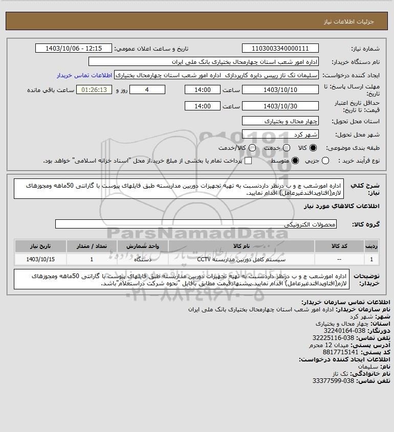 | 1 | -- | سیستم کامل دوربین مداربسته CCTV | دستگاه | 1 | 1403/10/15 |