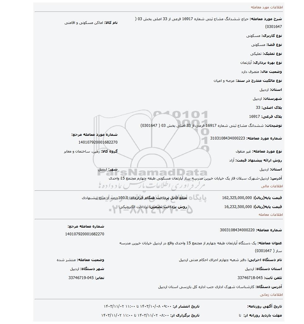 شرح مورد معامله: حراج ششدانگ مشاع ثبتی شماره 16917 فرعی از 33 اصلی بخش 03 ( 0301647) | نام کالا: اماکن مسکونی و اقامتی | |
