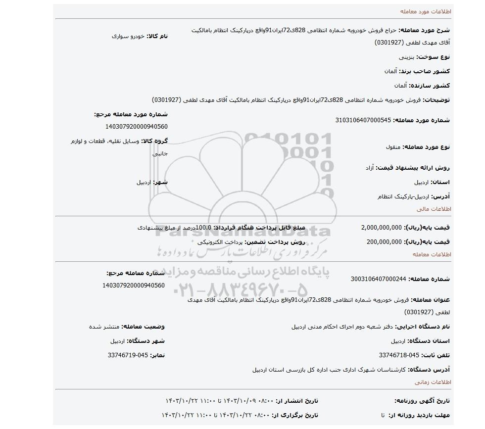 عنوان معامله: فروش خودروبه شماره انتظامی 828ی72ایران91واقع درپارکینک انتظام بامالکیت آقای مهدی لطفی (0301927) | ||