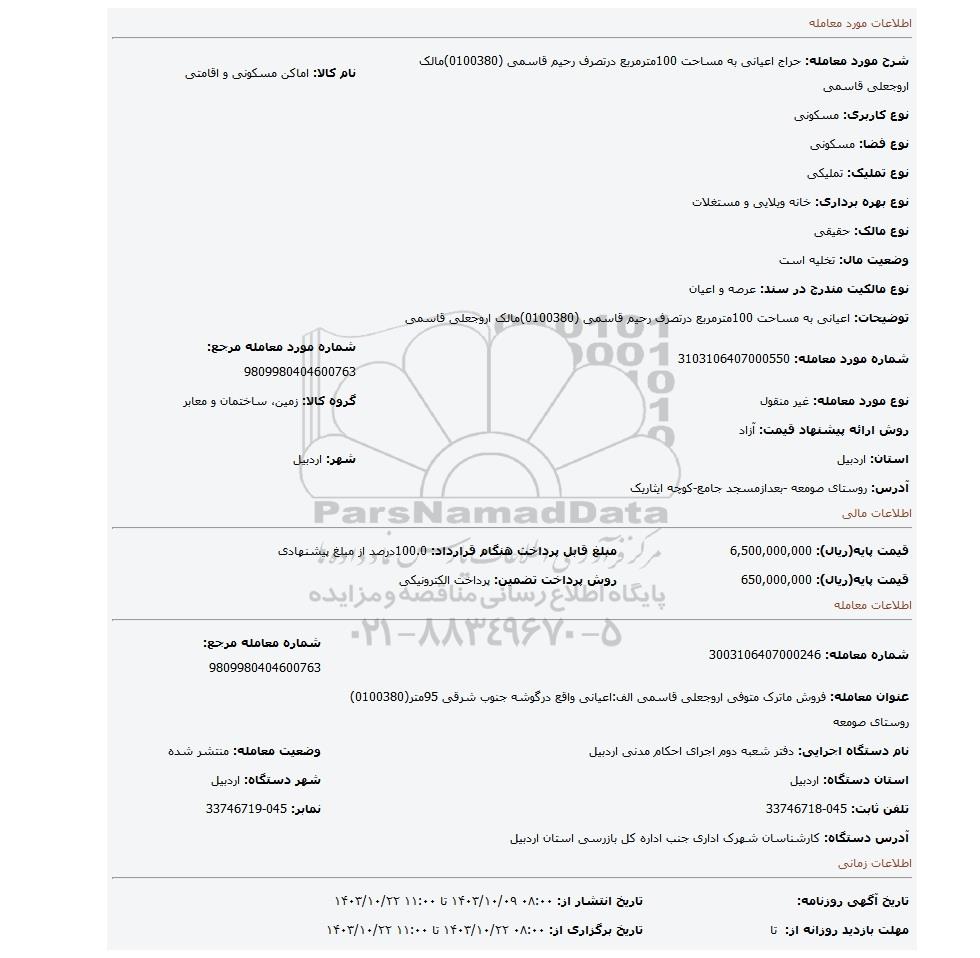 شرح مورد معامله: حراج اعیانی به مساحت 100مترمربع درتصرف رحیم قاسمی (0100380)مالک اروجعلی قاسمی نام کالا: اماکن مسکونی و اقامتی
