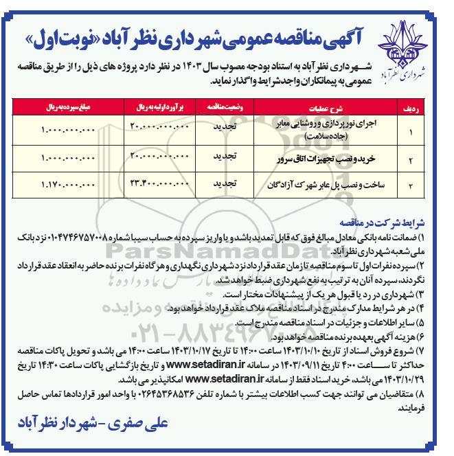 شهرداری نظرآباد به استناد مصوب سال 1403 در نظر دارد پروژه های ذیل را از طریق مناقصه عمومی به پیمانکاران واجد شرایط واگذار نماید