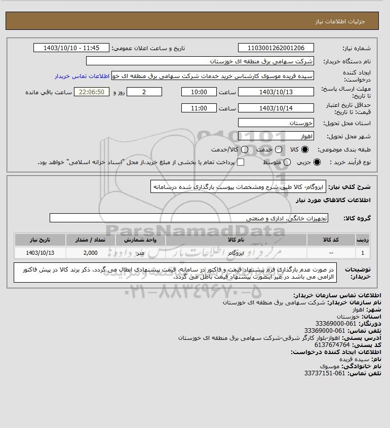 نام دستگاه خریدار:شرکت سهامی برق منطقه ای خوزستان