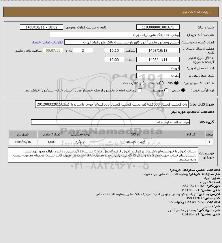 شرح کلی نیاز: ران گوشت گوساله500کیلو/کف دست گوشت گوساله500کیلو/نر جوون /ارسال با کدیکتا201208322815
