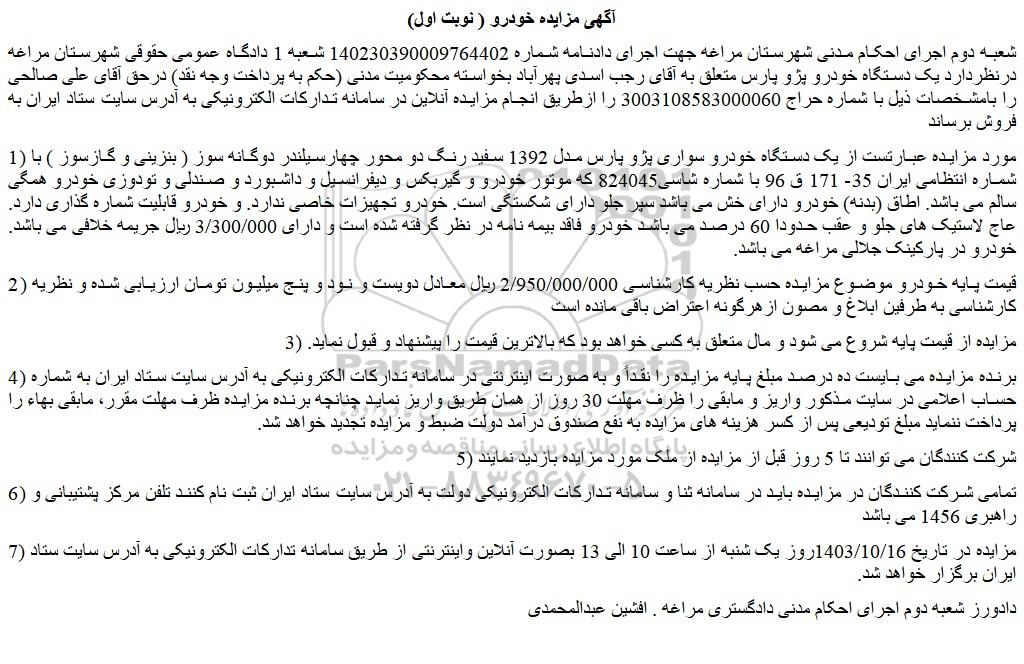 شعبه دوم اجرای احکام مدنی شهرستان مراغه جهت اجرای دادنامه شماره 140230390009764402 شعبه 1 دادگاه عمومی حقوقی شهرستان مراغه درنظردارد یک دستگاه خودرو پژو پارس متعلق به آقای رجب اسدی پهرآباد بخواسته محکومیت مدنی (حکم به پرداخت وجه نقد) درحق آقای علی صالحی را بامشخصات ذیل با شماره حراج 3003108583000060 را ازطریق انجام مزایده آنلاین در سامانه تدارکات الکترونیکی به آدرس سایت ستاد ایران به فروش برساند