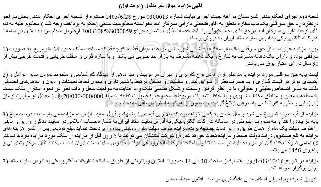 شعبه دوم اجرای احکام مدنی شهرستان مراغه جهت اجرای نیابت شماره 0300013 مورخ 1403/6/28 صادره از شعبه اجرای احکام مدنی بخش سراجو درنظردارد حق سرقفلی یک باب مغازه متعلق به آقای فتحعلی دارابی سرکار آباد بخواسته محکومیت مدنی (حکم به پرداخت وجه نقد ) محکوم علیه به نام آقای توحید دارابی سرکار آباد درحق آقای احمد کهولی را بامشخصات ذیل با شماره حراج 3003108583000059 ازطریق انجام مزایده آنلاین در سامانه تدارکات الکترونیکی به آدرس سایت ستاد ایران به فروش برساند: