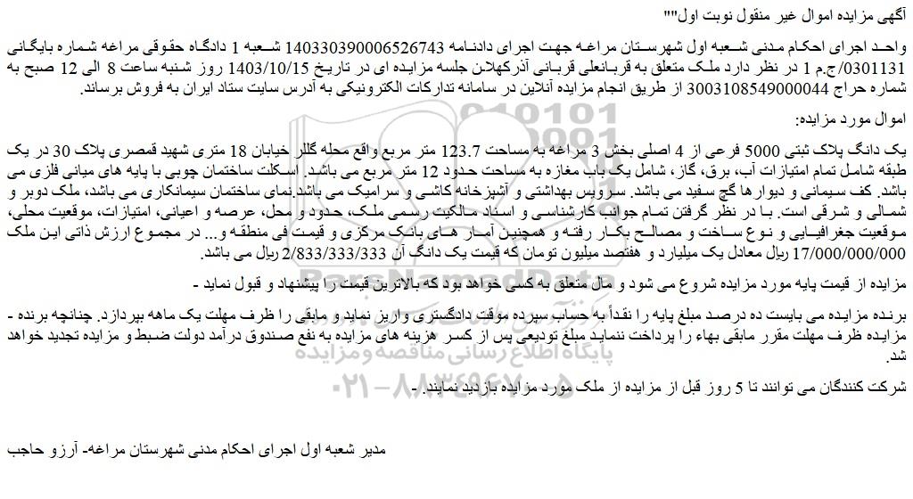 واحد اجرای احکام مدنی شعبه اول شهرستان مراغه جهت اجرای دادنامه 140330390006526743 شعبه 1 دادگاه حقوقی مراغه شماره بایگانی 0301131/ج.م 1 در نظر دارد ملک متعلق به قربانعلی قربانی آذرکهلان جلسه مزایده ای در تاریخ 1403/10/15 روز شنبه ساعت 8 الی 12 صبح به شماره حراج 3003108549000044 از طریق انجام مزایده آنلاین در سامانه تدارکات الکترونیکی به آدرس سایت ستاد ایران به فروش برساند.
