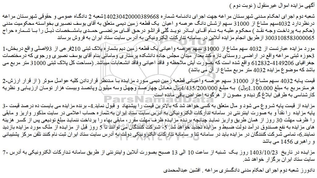 شعبه دوم اجرای احکام مدنی شهرستان مراغه جهت اجرای دادنامه شماره 140230420000389668شعبه 2 دادگاه عمومی و حقوقی شهرستان مراغه درنظردارد 4032سهم مشاع از 31000 سهم از شش دانگ عرصه و اعیان  یک قطعه زمین دیمی متعلق به آقای یوسف نصیری بخواسته محکومیت مدنی (حکم به پرداخت وجه نقد ) محکوم علیه به نام آقای اباذر نوید گلی قراتلو درحق آقای مرتضی حمدی بامشخصات ذیل را با شماره حراج 3003108583000065 ازطریق انجام مزایده آنلاین در سامانه تدارکات الکترونیکی به آدرس سایت ستاد ایران به فروش برساند