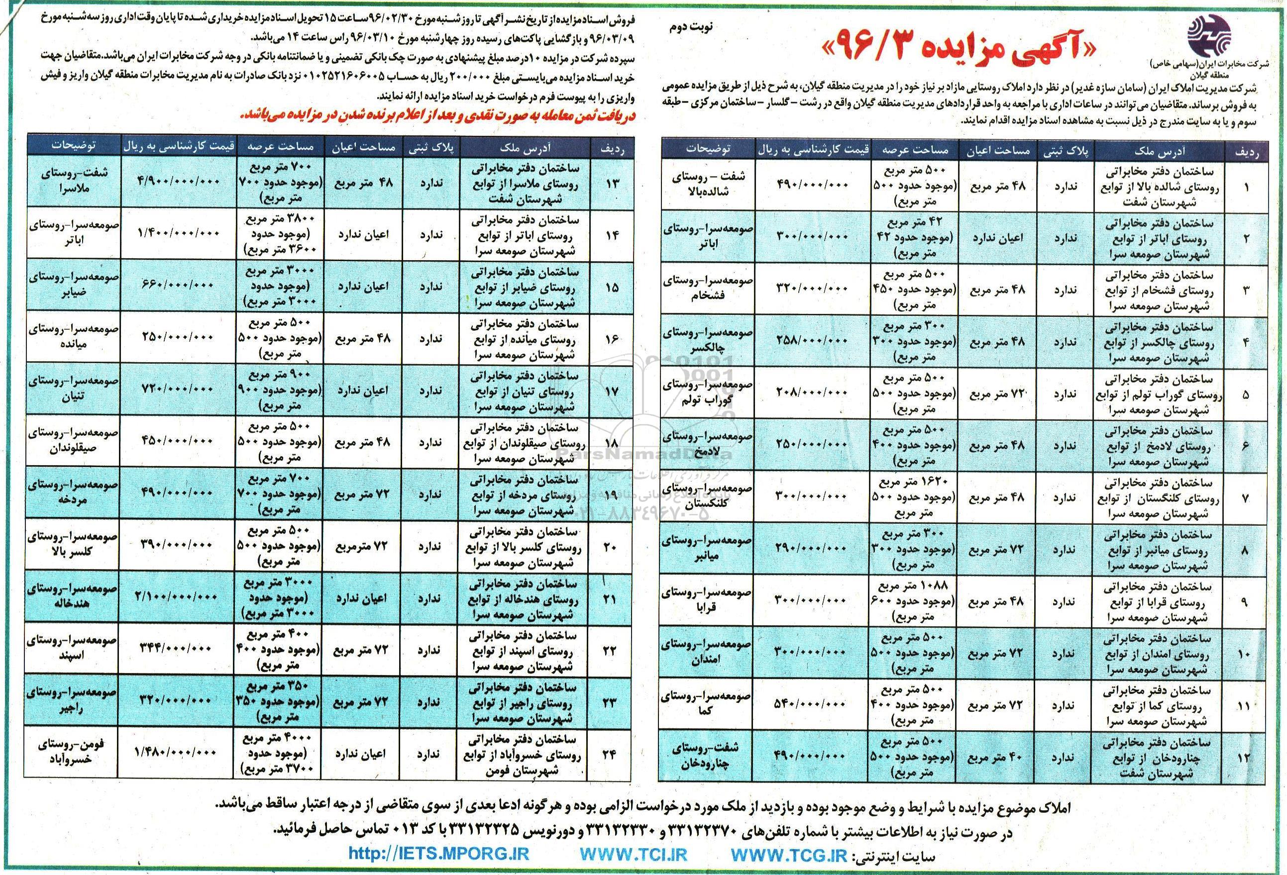 مزایده عمومی مزایده فروش املاک روستایی مازاد بر نیاز نوبت دوم برگزار میگردد. از کلیه افراد متخصص و شرکتهای واجد شرایط دعوت به عمل میآید تا در این مزایده با کد خبرگزاری پارس نماد : 847413 شرکت نمایند تاریخ شروع مزایده : 1396/02/23 مهلت شرکت در مزایده: تا پایان روز 1396/02/30 مکان برگزاری اموال واگذاری استانهای گیلان و دستهبندیهای مربوط به این حراجی املاک و زمین میباشد.
