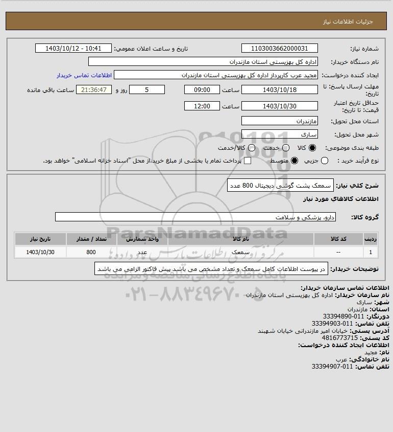 شرح کلی نیاز: سمعک پشت گوشی دیجیتال 800 عدد