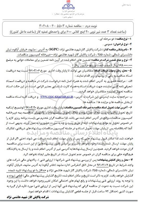 SGPC) به آدرس: مشهد، خیابان آبکوه، نبش دانشسرای شمالی، شماره 255، شرکت پالایش گاز شهید هاشمی نژاد، دبیرخانه کمیسیون مناقصات