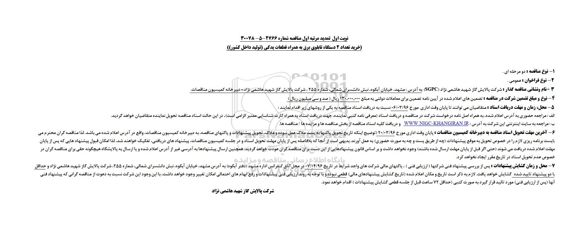 3- نام و نشانی مناقصه گذار: شرکت پالایش گاز شهید هاشمی نژاد (SGPC) به آدرس: مشهد، خیابان آبکوه، نبش دانشسرای شمالی، شماره 255، شرکت پالایش گاز شهید هاشمی نژاد، دبیرخانه کمیسیون مناقصات