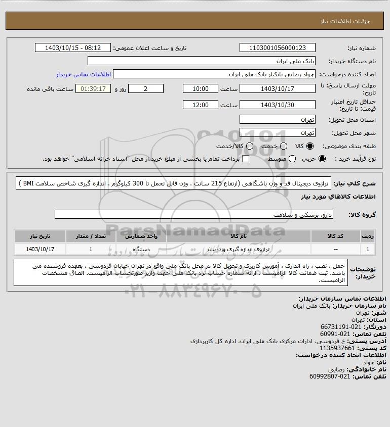 | 1 | -- | ترازوی اندازه گیری وزن بدن | دستگاه | 1 | 1403/10/17 |