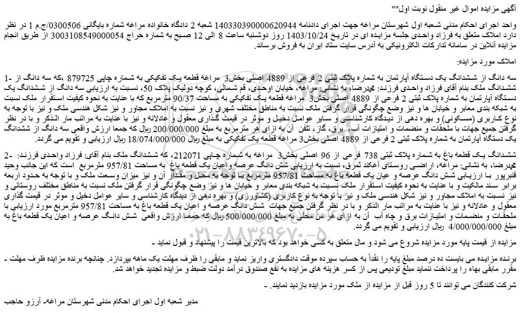 واحد اجرای احکام مدنی شعبه اول شهرستان مراغه جهت اجرای دادنامه 140330390000620944 شعبه 2 دادگاه خانواده مراغه شماره بایگانی 0300506/ج.م 1 در نظر دارد املاک متعلق به فرزاد واحدی جلسه مزایده ای در تاریخ 1403/10/24 روز دوشنبه ساعت 8 الی 12 صبح به شماره حراج 3003108549000054 از طریق انجام مزایده آنلاین در سامانه تدارکات الکترونیکی به آدرس سایت ستاد ایران به فروش برساند.