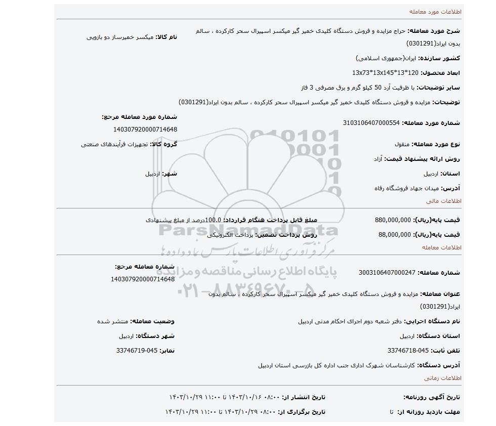 عنوان معامله: مزایده و فروش دستگاه کلیدی خمیر گیر میکسر اسپیرال سحر کارکرده ، سالم بدون ایراد(0301291)