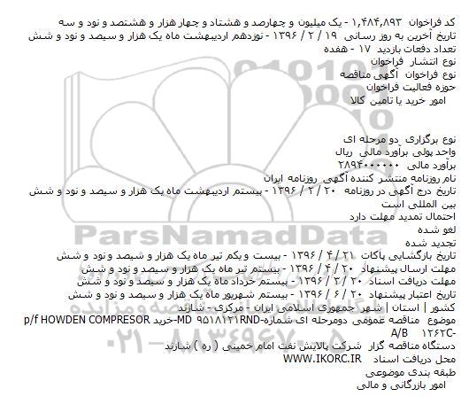 موضوع مناقصه عمومی دومرحله ای شمارهRND-۹۵۱۸۱۲۱-MD خرید p/f HOWDEN COMPRESOR C-۱۲۶۲A/B