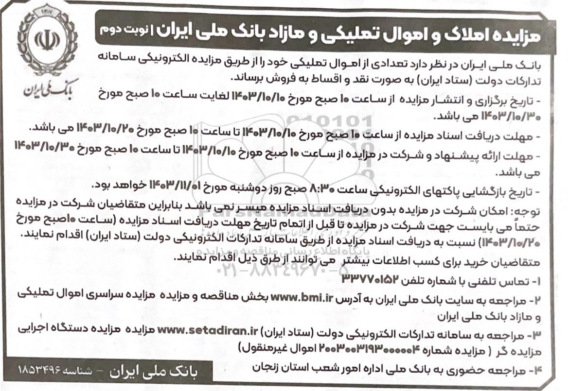 مزایده املاک و اموال تملیکی و مازاد بانک ملی ایران ؟