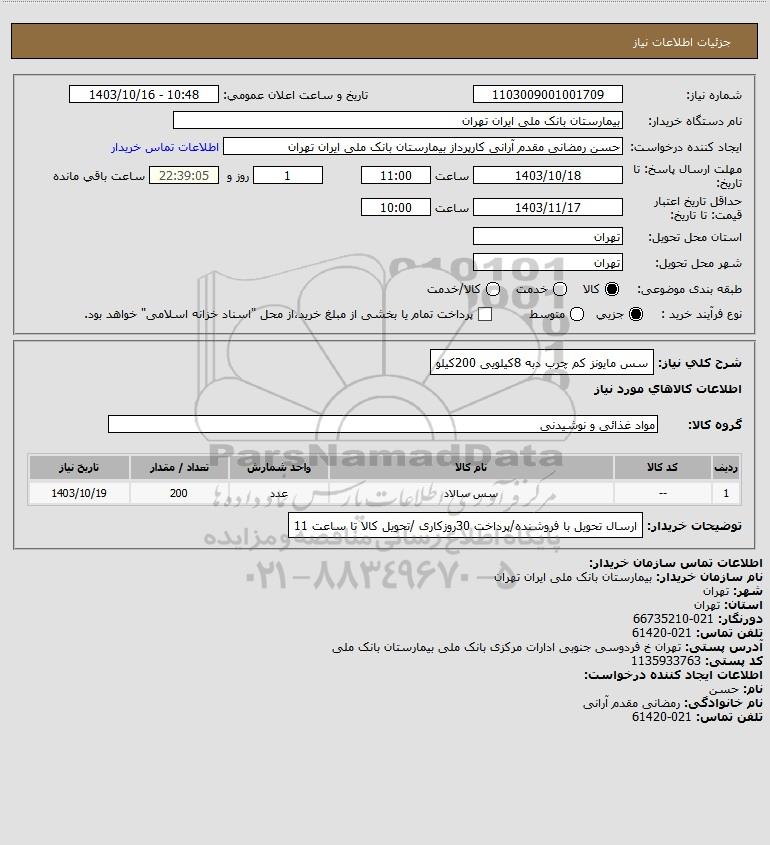 شرح کلی نیاز: سس مایونز کم چرب دبه 8کیلویی 200کیلو