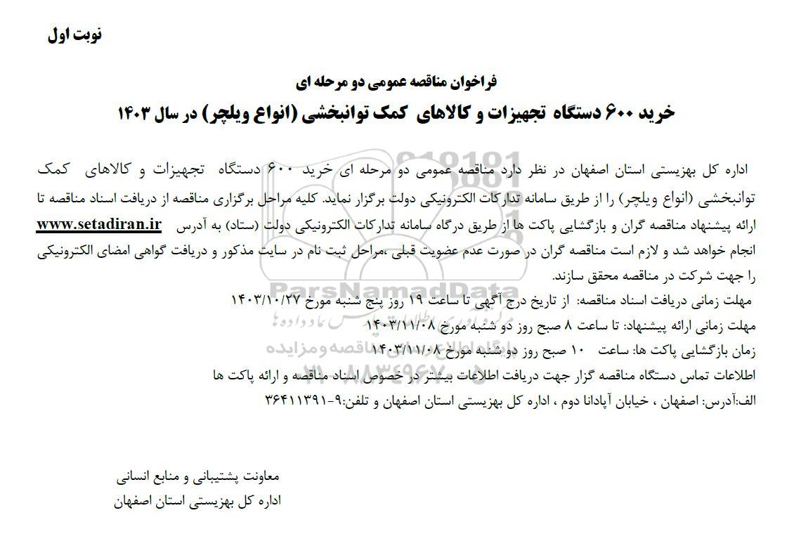 اداره کل بهزیستی استان اصفهان در نظر دارد مناقصه عمومی دو مرحله ای خرید 600 دستگاه تجهیزات و کالاهای کمک توانبخشی (انواع ویلچر) را از طریق سامانه تدارکات الکترونیکی دولت برگزار نماید. کلیه مراحل برگزاری مناقصه از دریافت اسناد مناقصه تا ارائه پیشنهاد مناقصه گران و بازگشایی پاکت ها از طریق درگاه سامانه تدارکات الکترونیکی دولت (ستاد) به آدرس ستاد ایران انجام خواهد شد و لازم است مناقصه گران در صورت عدم عضویت قیلی مراحل ثبت نام در سایت مذکور و دریافت گواهی امضای الکترونیکی را جهت شرکت در مناقصه محقق سازند.