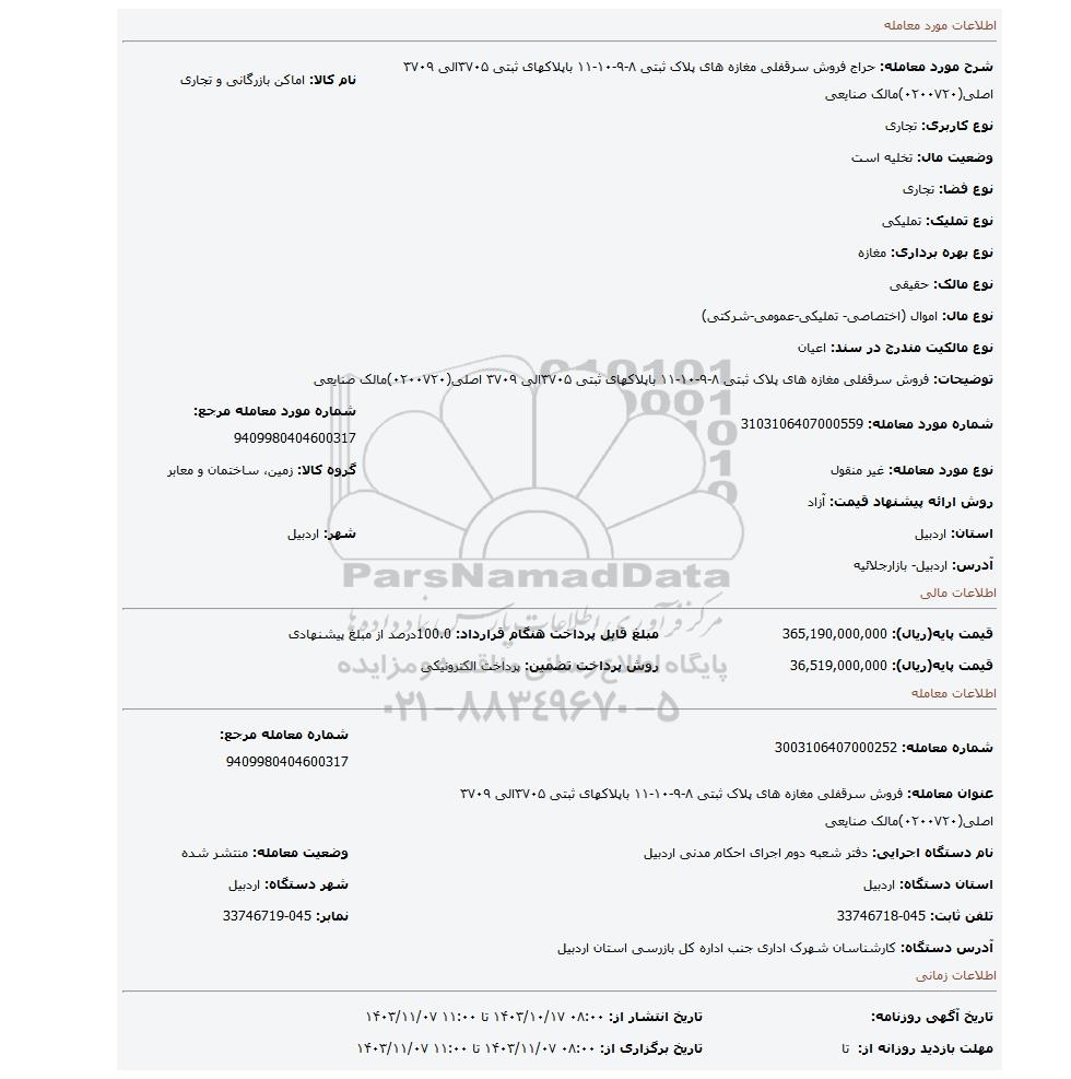شماره مورد معامله: 3103106407000559 | شماره مورد معامله مرجع: 9409980404600317 | |