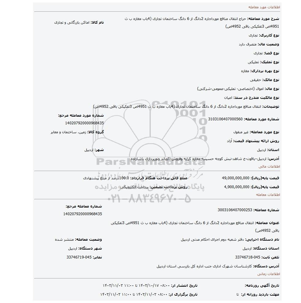 شرح مورد معامله: حراج انتقال منافع مورداجاره 2دانگ از 6 دانگ ساختمان تجاری (4باب مغازه ب ث 4951اص 3تفکیکی باقی 4952اص) | نام کالا: اماکن بازرگانی و تجاری | |