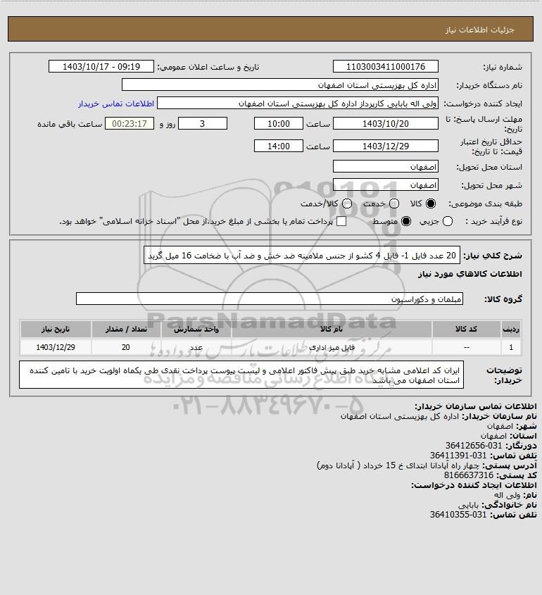 شرح کلی نیاز: 20 عدد فایل 1- فایل 4 کشو از جنس ملامینه ضد خش و ضد آب با ضخامت 16 میل گرید