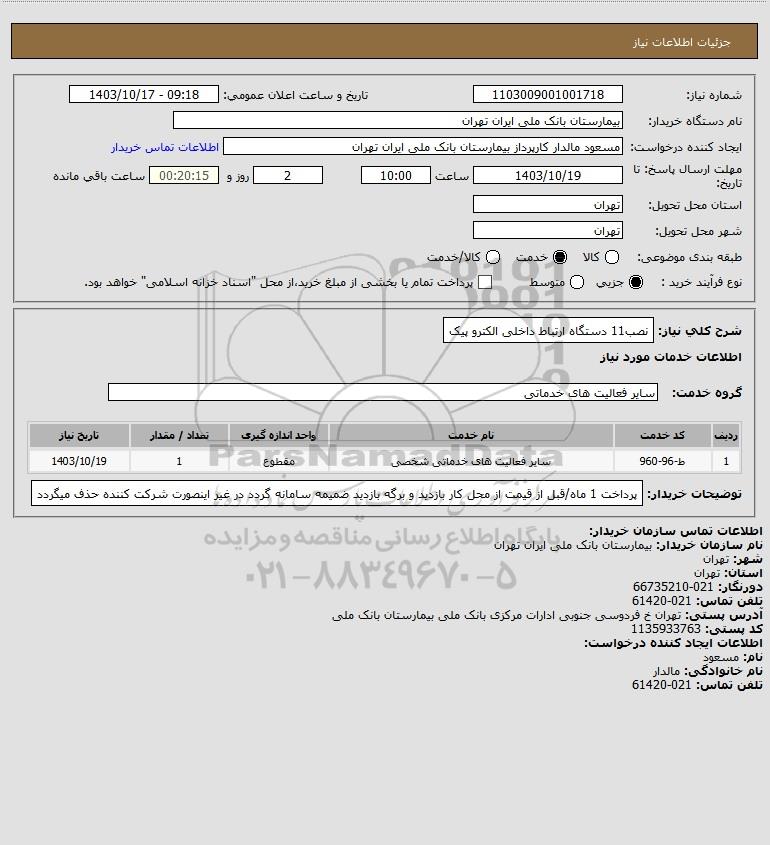 استعلام نصب11 دستگاه ارتباط داخلی الکترو پیک, استعلام نصب11 دستگاه ارتباط داخلی الکترو پیک