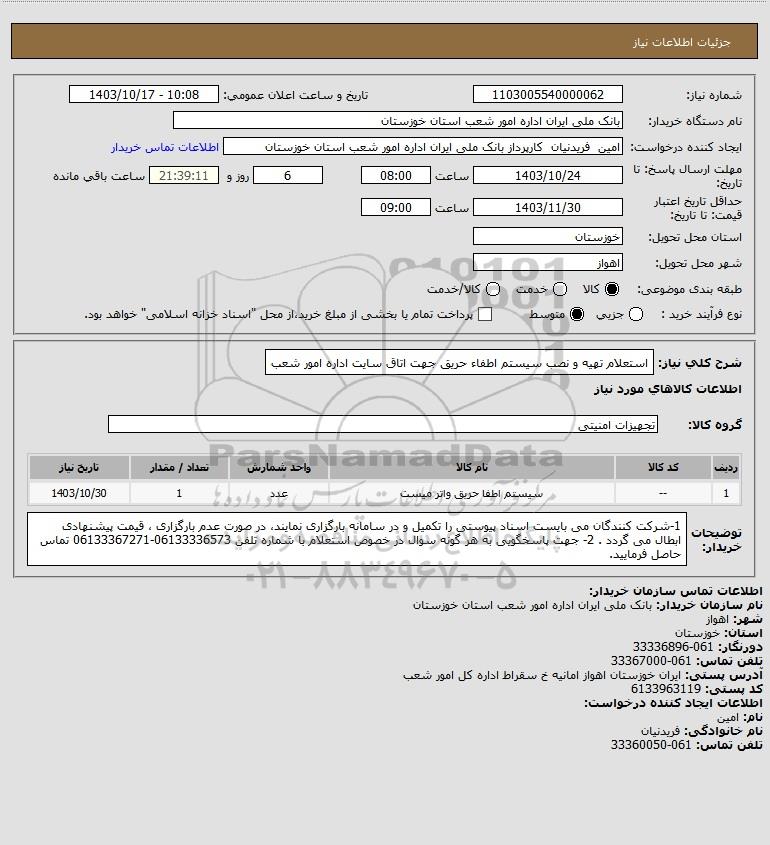 استعلام استعلام تهیه و نصب سیستم اطفاء حریق جهت اتاق سایت اداره امور شعب, استعلام استعلام تهیه و نصب سیستم اطفاء حریق جهت اتاق سایت اداره امور شعب
