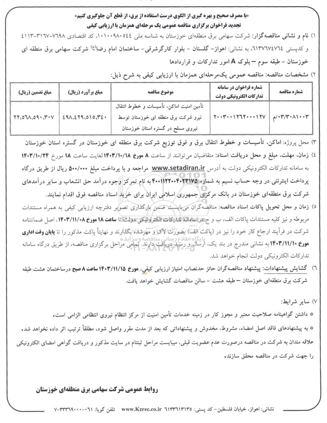 3081003 / 03 / م 2003001262000127 تامین امنیت اماکن، تاسیسات و خطوط انتقال نیرو شرکت برق منطقه ای خوزستان توسط نیروی مسلح در گستره استان خوزستان 498.429.515.340 22.568.590.307