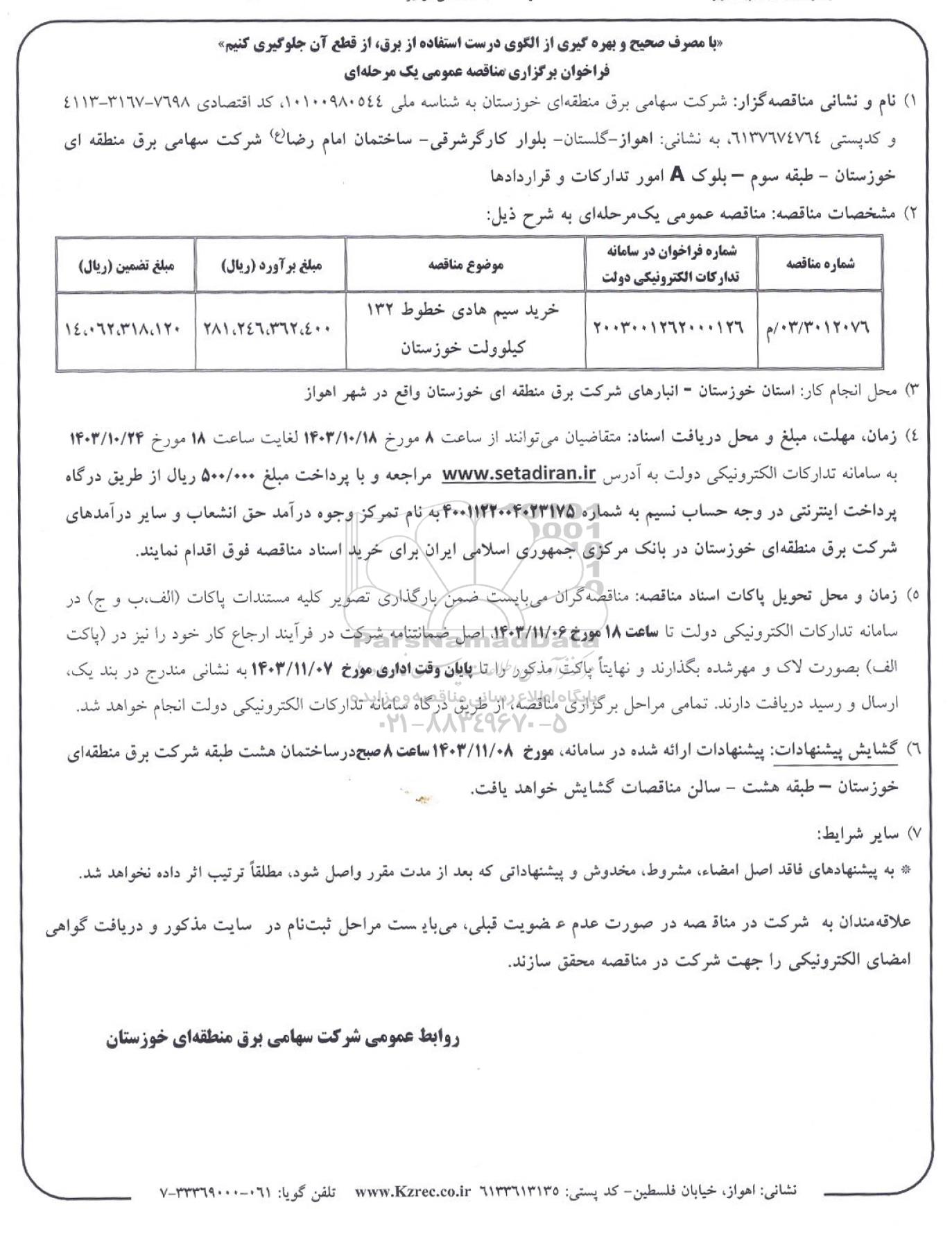 03/3012076/م            2003001262000126 خرید سیم هادی خطوط 132 کیلوولت خوزستان 281.246.362.400 14.062.318.120