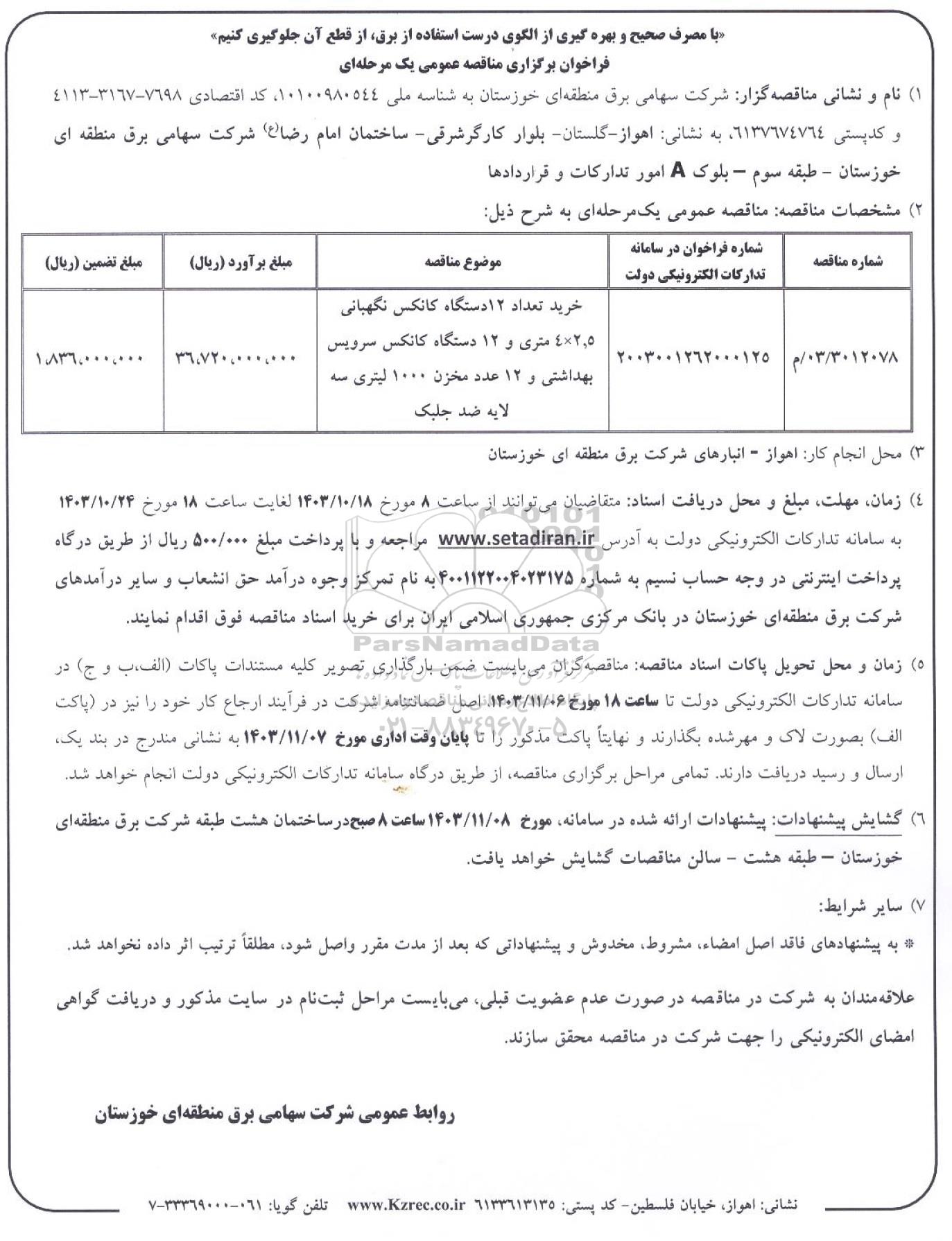 (1) نام و نشانی مناقصه گزار: شرکت سهامی برق منطقه ای خوزستان به شناسه ملی 10100980544 کد اقتصادی 7698-3167-4113 و کدپستی 6137674764 ، به نشانی اهواز - گلستان بلوار کارگر شرقی - ساختمان امام رضا(ع) شرکت سهامی برق منطقه ای خوزستان - طبقه سوم - بلوک A امور تدارکات و قراردادها