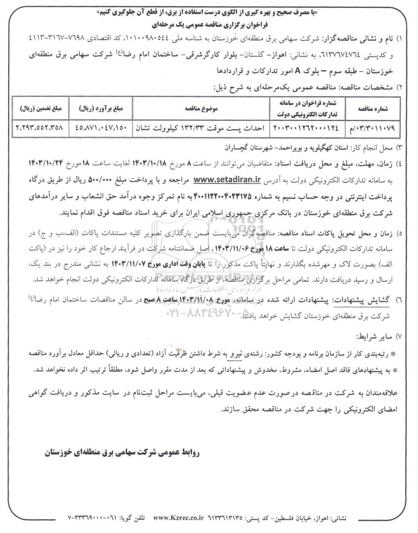 (1) نام و نشانی مناقصه گزار شرکت سهامی برق منطقه ای خوزستان به شناسه ملی 10100980544 کد اقتصادی 7698-3167-4113 و کدپستی 6137674764 به نشانی اهواز گلستان - بلوار کارگر شرقی ساختمان امام رضا(ع) شرکت سهامی برق منطقه ای خوزستان - طبقه سوم - بلوک A امور تدارکات و قراردادها