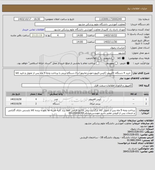 شرح کلی نیاز: خرید 4 دستگاه کامپیوتر (کیس-کیبورد-موس-مانیتور) و 2 دستگاه پرینتر با پرداخت وجه 5 ماه پس از تحویل و تایید کالا
