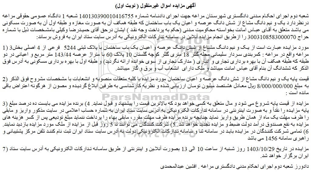 شعبه دوم اجرای احکام مدنی دادگستری شهرستان مراغه جهت اجرای دادنامه شماره 140130390010416755 شعبه 1 دادگاه عمومی حقوقی مراغه درنظردارد یک و نیم دانگ مشاع از شش دانگ عرصه و اعیان یک باب ساختمان که طبقه همکف آن به صورت مغازه و طبقه اول آن به صورت مسکونی می باشد متعلق به آقای عباس امانت بخواسته محکومیت مدنی (حکم به پرداخت وجه نقد ) ایشان درحق آقای حمیدرضا وکیلی بامشخصات ذیل با شماره حراج 3003108583000070 را ازطریق انجام مزایده آنلاین در سامانه تدارکات الکترونیکی به آدرس سایت ستاد ایران به فروش برساند: