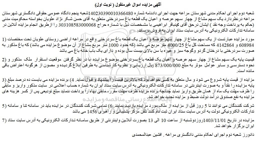 شعبه دوم اجرای احکام مدنی شهرستان مراغه جهت اجرای دادنامه شماره 140230390010366480شعبه پنجم دادگاه عمومی حقوقی دادگستری شهرستان مراغه درنظردارد یک سهم مشاع از چهار سهم عرصه و اعیان یک قطعه باغ سردرختی متعلق به آقای حسن شکر نژاد علویان بخواسته محکومیت مدنی (حکم به پرداخت وجه نقد ) ایشان درحق آقای محمدباقر ابراهیمی با مشخصات ذیل با شماره حراج 303108583000068 را ازطریق انجام مزایده آنلاین در سامانه تدارکات الکترونیکی به آدرس سایت ستاد ایران به فروش برساند: