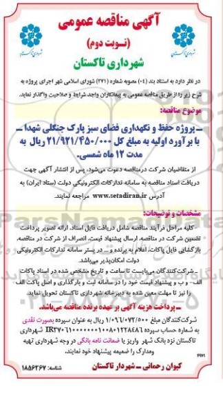 پروژه حفظ و نگهداری فضای سبز پارک جنگلی شهدا - با برآورد اولیه بمبلغ کل 21.921.450.000 ریال بمدت 12 ماه شمسی