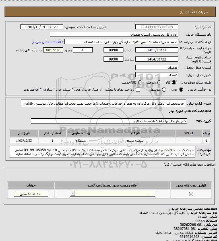 استعلام بها و موضوع استعلام استعلام خریدتجهیزات اتاقک دکل مرکزداده به همراه اقدامات وخدمات لازم جهت نصب تجهیزات مطابق فایل پیوستی والزامی به اطلاع کلیه شرکت‌ها و افراد متخصص واجد شرایط می‌رساند، آگهی گذار در نظر دارد از طریق استعلام بها، نسبت به انتخاب و دریافت پیشنهادات اقدام نماید. این استعلام با کد آگهی ثبت شده در سامانه خبرگزاری پارس نماد : 8504628 منتشر شده است. مشخصات استعلام : تاریخ شروع استعلام: 1403/10/19 آخرین مهلت ارسال پیشنهاد قیمت : 1403/10/23 و محل اجرای پروژه : استان مناقصات استان همدان میباشد. استعلام قیمت مورد درخواست : استعلام خریدتجهیزات اتاقک دکل مرکزداده به همراه اقدامات وخدمات لازم جهت نصب تجهیزات مطابق فایل پیوستی والزامی با دسته‌بندی‌های تخصصی و گروه های مرتبط : انواع تابلو و راکهای مخابراتی و برقی, سیم و کابل, کامپیوتر, اینترنت شبکه, منابع تغذیه, تجهیزات مخابرات, تجهیزات برق و الکترونیک, استعلام اطلاع رسانی میگردد.
