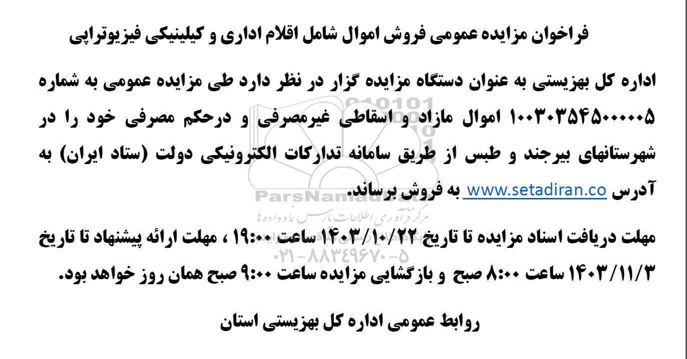 فراخوان مزایده عمومی فروش اموال شامل اقلام اداری و کیلینیکی فیزیوتراپی؟