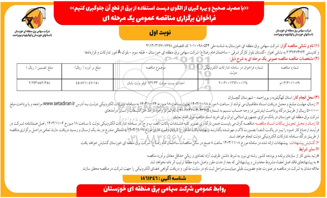 (1) نام و نشانی مناقصه گزار شرکت سهامی برق منطقه ای خوزستان به شناسه ملی 10100980544 کد اقتصادی 7698-3167-4113 و کدپستی 6137674764 به نشانی اهواز گلستان - بلوار کارگر شرقی ساختمان امام رضا(ع) شرکت سهامی برق منطقه ای خوزستان - طبقه سوم - بلوک A امور تدارکات و قراردادها