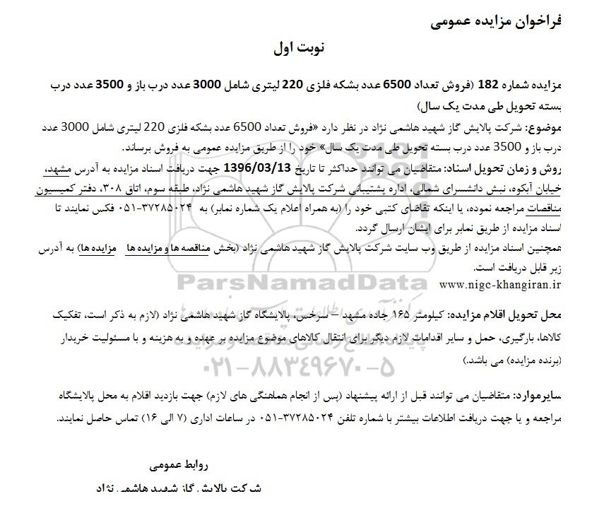 مزایده شماره 182 فروش تعداد 6500 عدد بشکه فلزی 220 لیتری شامل 3000 عدد درب باز و 3500 عدد درب بسته تحویل طی مدت یکسال خود را از طریق مزایده عمومی به فروش برساند.