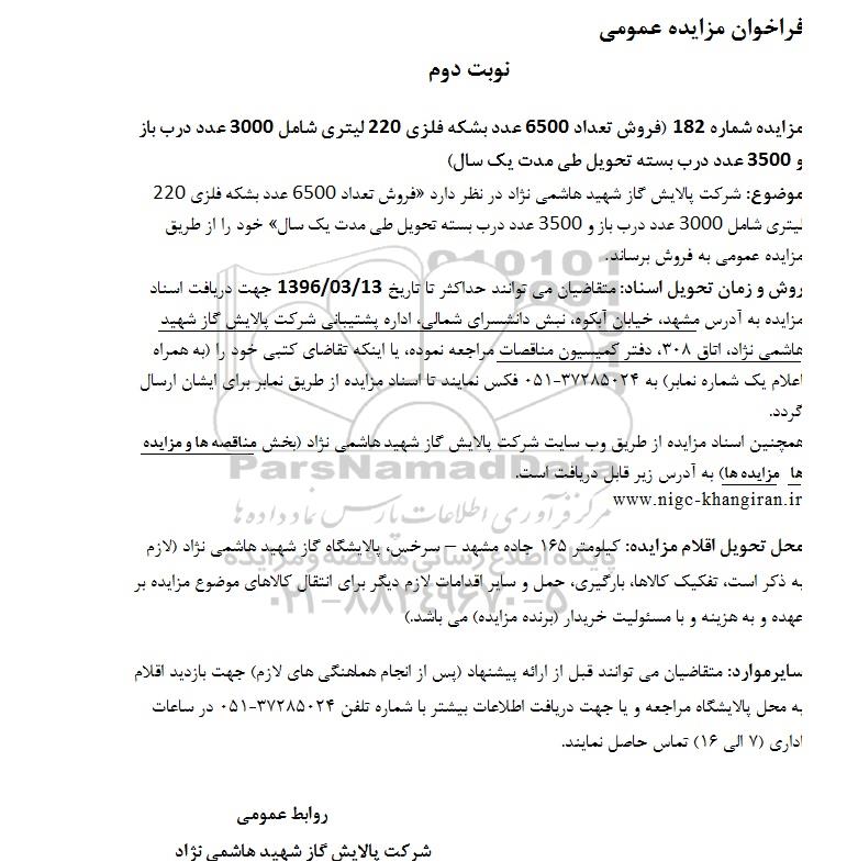 مزایده شماره 182 فروش تعداد 6500 عدد بشکه فلزی 220 لیتری شامل 3000 عدد درب باز و 3500 عدد درب بسته تحویل طی مدت یکسال خود را از طریق مزایده عمومی به فروش برساند.