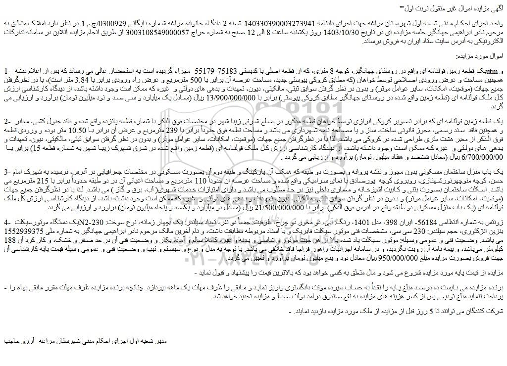 واحد اجرای احکام مدنی شعبه اول شهرستان مراغه جهت اجرای دادنامه 140330390003273941 شعبه 2 دادگاه خانواده مراغه شماره بایگانی 0300929/ج.م 1 در نظر دارد املاک متعلق به مرحوم نادر ابراهیمی جهانگیر جلسه مزایده ای در تاریخ 1403/10/30 روز یکشنبه ساعت 8 الی 12 صبح به شماره حراج 3003108549000057 از طریق انجام مزایده آنلاین در سامانه تدارکات الکترونیکی به آدرس سایت ستاد ایران به فروش برساند.