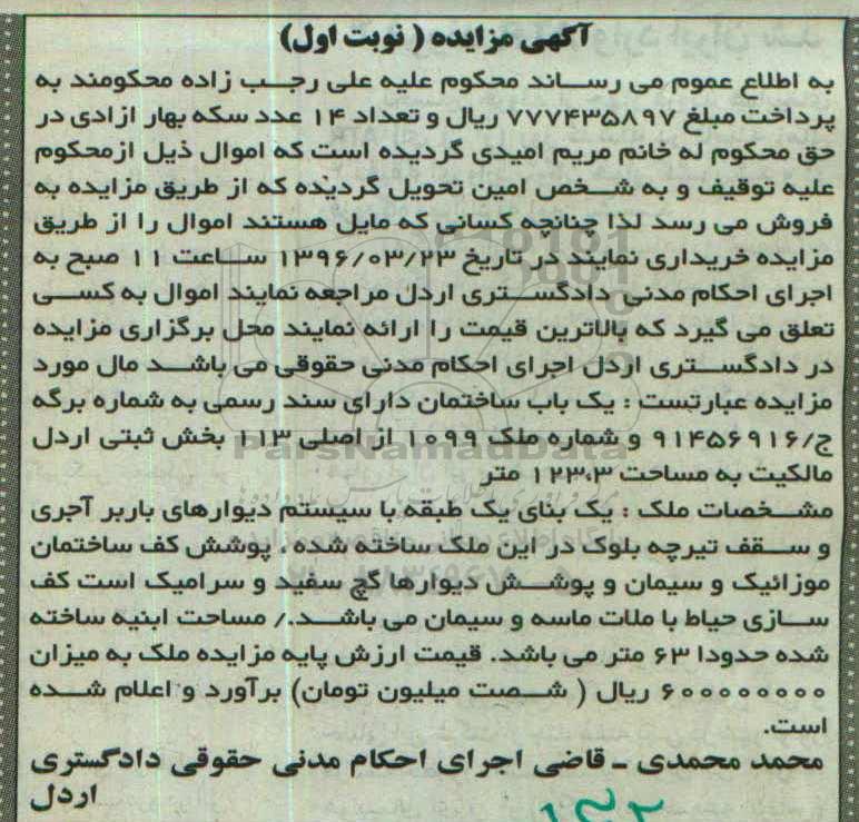 مزایده یکباب ساختمان به مساحت123.3متر نوبت اول