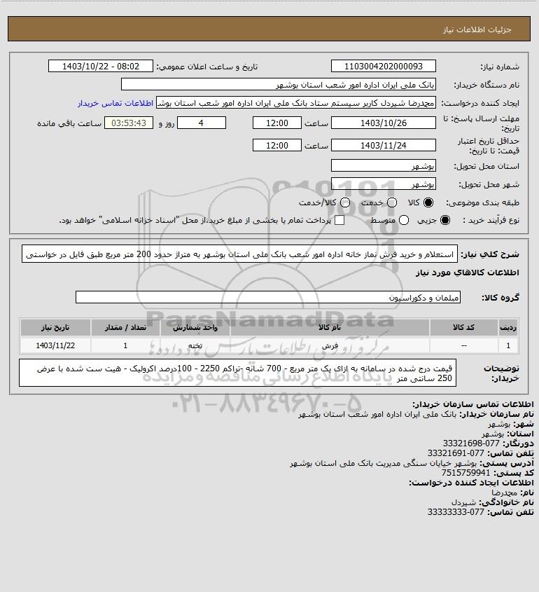 شرح کلی نیاز: استعلام و خرید فرش نماز خانه اداره امور شعب بانک ملی استان بوشهر به متراژ حدود 200 متر مربع طبق فایل در خواستی