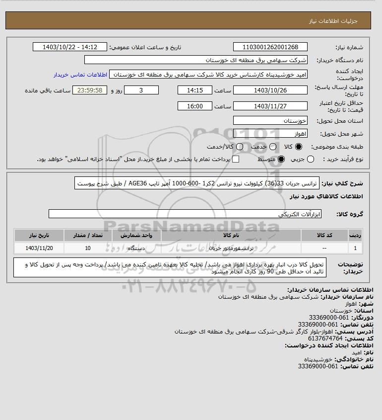 استعلام ترانس جریان 33(36) کیلوولت نیرو ترانس 2کر1 -600-1000 آمپر تایپ AGE36 / طبق شرح پیوست, استعلام ترانس جریان 33(36) کیلوولت نیرو ترانس 2کر1 -600-1000 آمپر تایپ AGE36 / طبق شرح پیوست