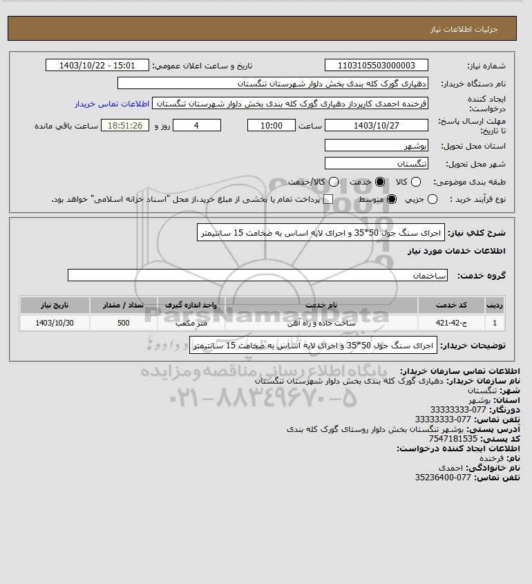 شرح کلی نیاز: اجرای سنگ جول 50*35 و اجرای لایه اساس به ضخامت 15 سانتیمتر