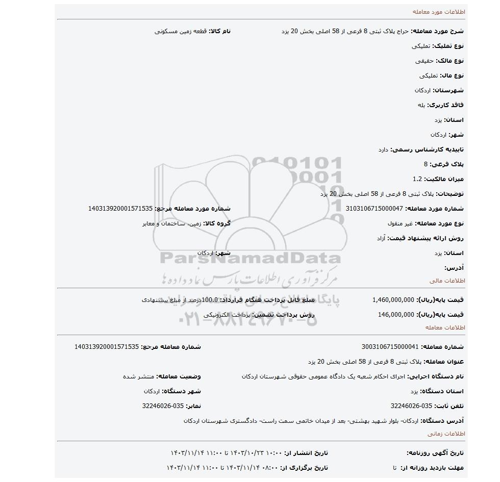| شرح مورد معامله: حراج پلاک ثبتی 8 فرعی از 58 اصلی بخش 20 یزد | نام کالا: قطعه زمین مسکونی | |
