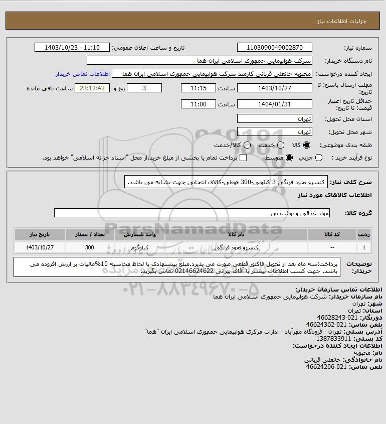 | 1 | -- | کنسرو نخود فرنگی | کیلوگرم | 300 | 1403/10/27 |