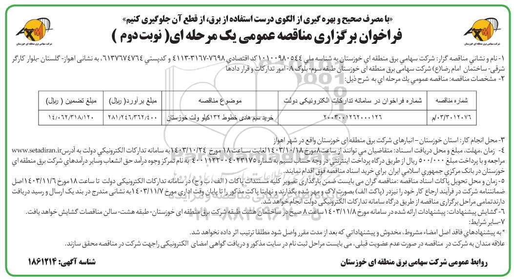 03/3012076/م | 2003001262000126 | خرید سیم هادی خطوط 132 کیلوولت خوزستان | 281.246.362.400 | 14.062.318.120 |